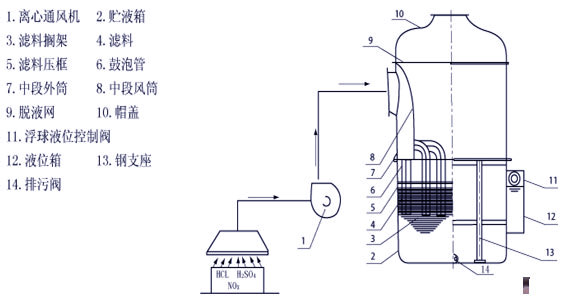 酸雾废气由引风机吸入预处理净化塔,经高速喷淋,填料处理后,再迫使气体由鼓泡管进入储液箱的吸收液中产生鼓泡,然后再经过筛板层,减速进入内筒处理器经过二级喷淋、填料处理后,再由渐扩段进入。上部慢速喷淋、填料功能段处理。这样使酸雾废气经过多功能段,多级处理逐步地使酸雾废气得雾器脱液除雾后由引风机压入主处理塔经高速喷淋,填料处理后让废气与中和液彻底反应,净化处理后尾气通过排风管进入大气。