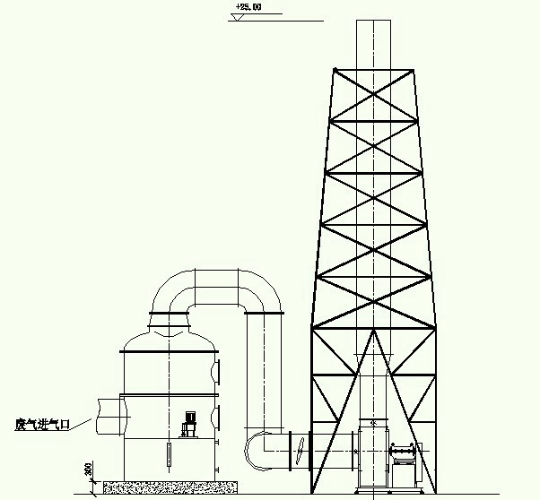本设备采用圆形塔体,具体由贮液箱、塔体、进风段、喷淋层、填料层、除雾层、观检孔等组成。