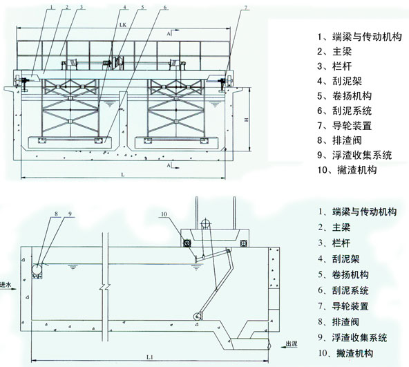 桥式刮泥机采用桁架式结构,当刮泥机不工作时,即停在进水端;当刮泥机工作时,顺水流行驶时,先放下撇渣板,将池面浮渣向池端钢制撇渣槽内,而刮泥板被提离池底;反向行驶时,放下刮泥板,将池底污泥刮向池端集泥槽内,而撇渣板被提起,离开液面,以防浮渣逆行;依此作往返工作运动,从而达到刮泥、撇渣的目的。