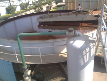 原水经絮凝混合由池底中心管流入,水表面的浮渣用撇渣器收集起来,然后排入中央污泥槽,排置相匹配的污泥装置,沉于池底的污泥由刮板收集至排泥槽排出,清水由中央集水机构收集排出。
